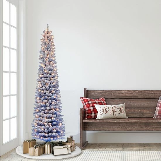 Display this eye-catching Puleo International 6.5-ft. pre-lit flocked fashion blue pencil artificial Christmas tree in your home for the holidays.